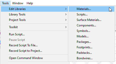 Click Tools>Edit Libraries to view menus allowing access to the libraries available for the various Ansys Electronic Desktop solves, such as Materials, Scripts, and Components, Symbols and Models for Simplorer, Icepak, and Circuit.