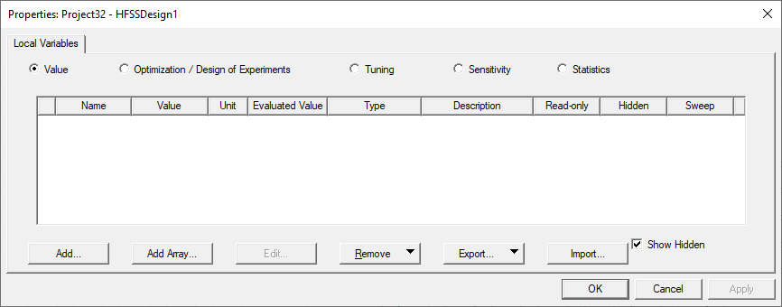 Clicking View > Variables brings up a dockable variable window that is associated with the active project and/or design. When there is an active project, there will be a corresponding project variable tab. When there is an active design, there will be a corresponding design variable tab. Each tab contains an Add... button allowing creation of new variable of this type. If variables exist for the Project or Design, they are shown in the corresponding tab.
