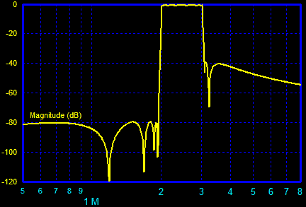 Band pass Elliptic filters may have the high pass and low legs set independently. Figure 1 illustrates a frequency asymmetrical Elliptic filter, 5th order low pass, 11th order high pass filter with the low pass and high pass legs set to 40dB and 80dB of attenuation respectively.