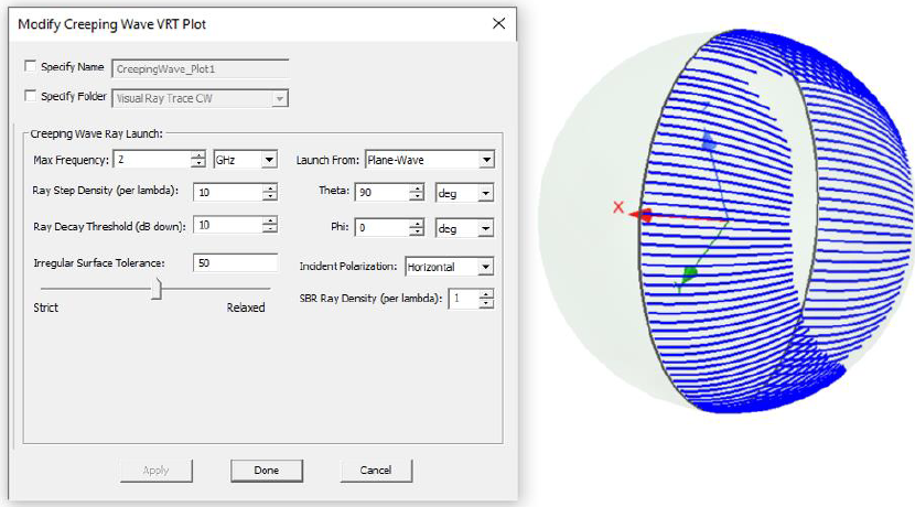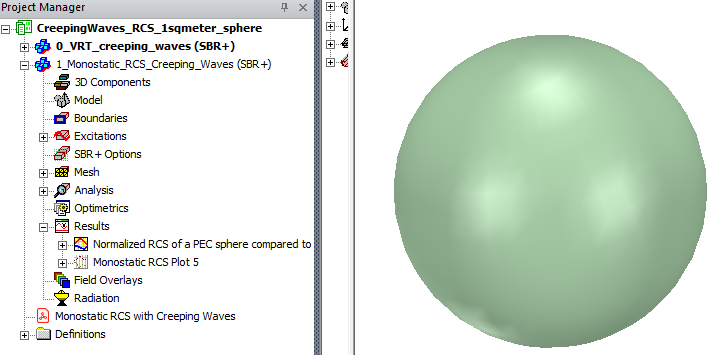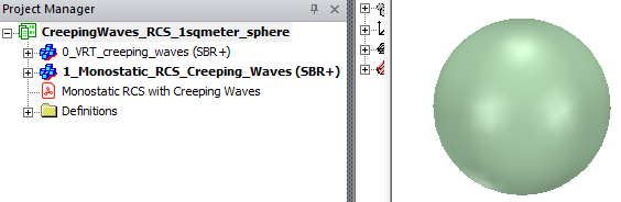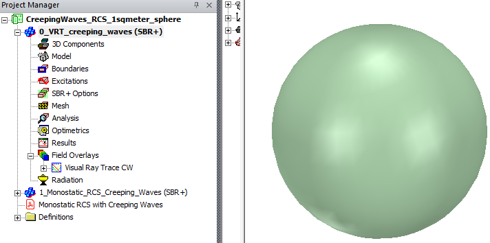 Description - The simulated geometry is a perfectly conducting sphere of radius 0.56419 meter. Monostatic RCS value of such a sphere in the optical region is 1 square meter. The term creeping wave refers to fields that propagate along smoothly curved surfaces. Finite fields in the shadow of a curved surface are due to the propagation of a creeping wave. Creeping waves decay quickly as they propagate, since they progressively shed energy to space along their direction of travel. As the curved structure increases in electrical size, the shadow region fields become weaker. Hence, while creeping waves keep propagating on a continuous smooth surface, such as a sphere, the currents they paint on a surface are important only up to a certain traveled distance. The goal of this example is to show how to simulate the Monostatic RCS of a sphere vs. frequency using SBR+ solver and compare the results simulated with and without enabling CW option.