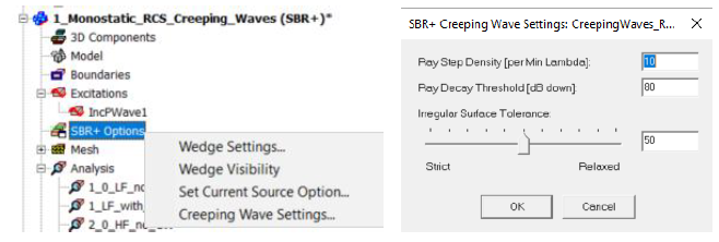 The same design might have several solution setups with and without creeping waves options. CW option is enabled in Options Tab of solution setup (see Fig.2). Setup 1_0_LF_no_CW: frequency from 0.05GHz to 2GHz, CW is not enabled Setup 1_LF_with_CW: frequency from 0.05GHz to 2GHz, CW is enabled Setup 2_0_HF_no_CW: frequency from 1GHz to 10GHz, CW is not enabled Setup 2_HF_with_CW: frequency from 1GHz to 10GHz, CW is enabled.