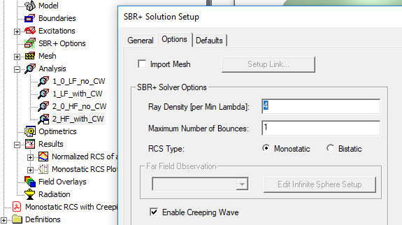 This model has 4 Analysis setups for Monostatic RCS of the sphere to cover two frequency ranges and to compare results with and without CW option enabled. CW options are part of SBR+ options and set throughout the design.