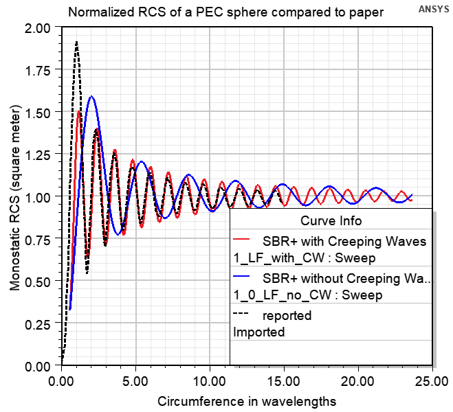 This example demonstrates how to use Creeping Waves (CW) option for RCS simulations of a conducing sphere in HFSS SBR+ design type. The project “CreepingWaves_RCS_1sqmeter_sphere” contains two designs: “0_VRT_creeping_waves” to visualize the CW rays and choose the proper CW setup options; “1_Monostatic_RCS_Creeping_Waves” to simulate the Monostatic RCS values. The Monostatic RCS with Creeping Waves pdf includes details and guidance on using and interpreting the model.