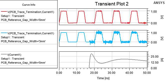 Description - This example shows how a 100MHz clock transmitted by a microstrip inside the jar is affected by the ESD. The variable "PCB_Reference_Gap_Width" controls the width of a gap in the reference plane under the microstrip. When the variable is 0mm (no gap) the induced noise on the clock signal is smaller when compared to a gap of 3mm. The setup includes a parametric sweep of the PCB reference gap width.