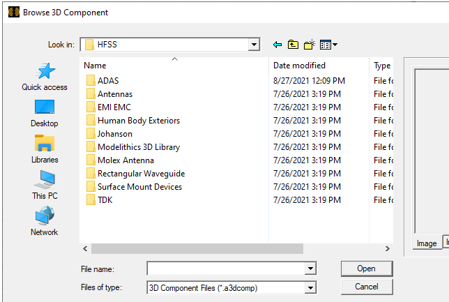 You can also access the ADAS 3D Component library using Draw>3D Component> Browse... to open the Browse 3D Component dialog. You then click SysLib to display the libraries included in your installation. Look under 3D Components\HFSS to see ADAS.