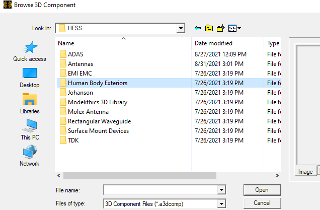 You can click Open to display the Insert 3D Component dialog box. You can view the Image and Info tabs for that component. Human Body Exteriors do not have parameters.