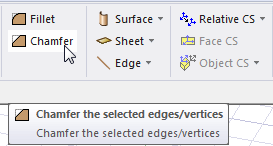 - From the menu bar, click Modeler> Chamfer or, on the Draw ribbon tab, click the Chamfer icon: