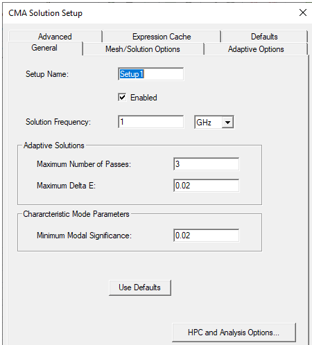 Define the adapt frequency and characteristic mode parameters on the CMA Solution Setup dialog box. For Characteristic Modes solution types, these include the following: