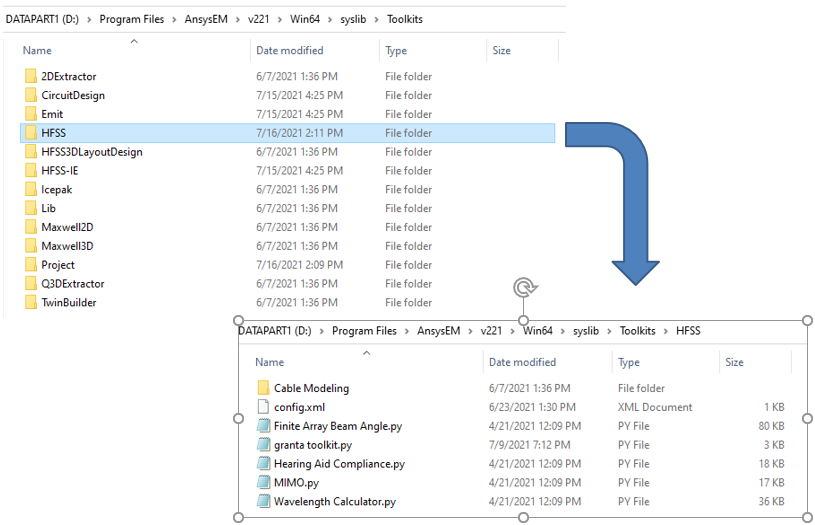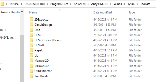 A directory called "Toolkits" appears in the syslib, userlib and personallib of HFSS installation. Menu items for files found in <installation>/syslib will be inserted at the first level of the menu.
