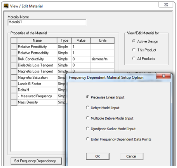 If a particular material is not found in the default HFSS material database, a custom material can be created. Frequency-dependent material can also be created if needed.