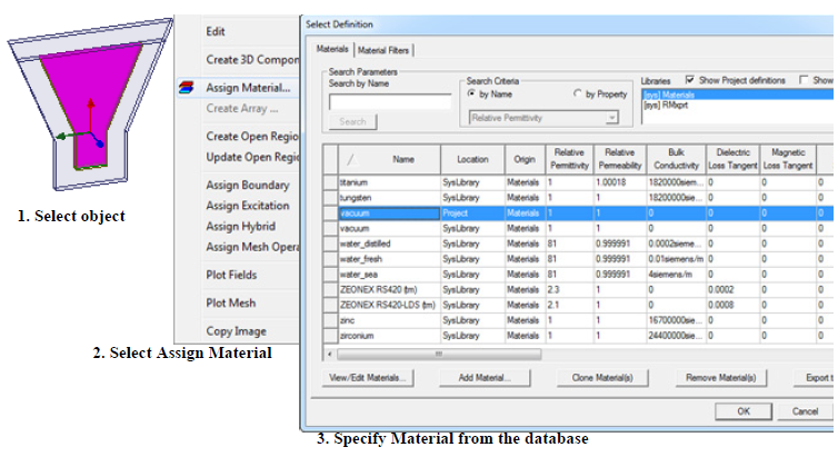 You can also define or change the material property of an object, from the Edit Libraries window. To bring up this window, go to the Tools menu and select the Edit Libraries > Materials. Select the material from the database and click OK to assign the desired material on the object.