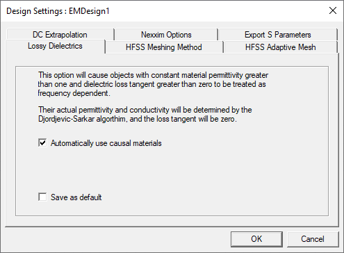 From the Project Manager window, right-click on a design and select Design Settings to open the Design Settings window and click the Lossy Dielectrics tab.