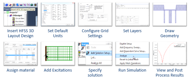 Setting up an HFSS 3D Layout design is very similar to setting up an HFSS design or an HFSS-IE design. To set up an HFSS 3D Layout design, follow this general procedure. After you insert a design, you do not need to perform the intermediate steps sequentially, but you must complete them before you generate a solution.