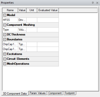 The Properties displayed for a selected 3D component depend on how you select that component. For a complete display of Properties, double click the selected component in the Layout editor. Alternatively, click Edit > Properties using the menu bar. This action displays a window with tabs for all component properties.