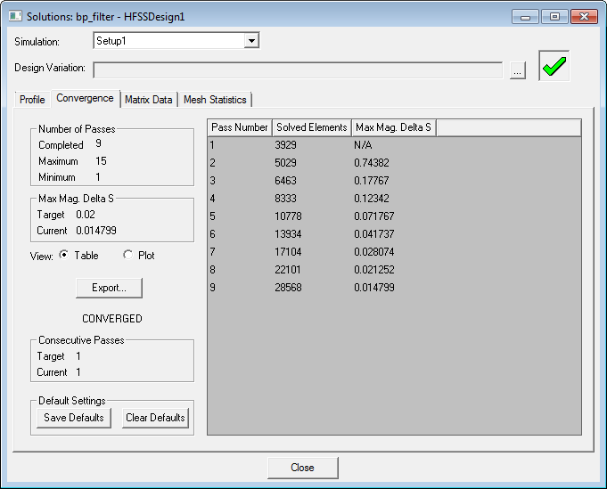 - If you have run multiple simulations, from the Simulation list, select the solution setup for which you want to view convergence data.