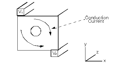 Because the bar is not a perfect insulator, current will flow between the two conductors. Given the conductors shown on the previous page, the relationship between the conduction current and the voltage drop, V, in each conductor is I = GV.