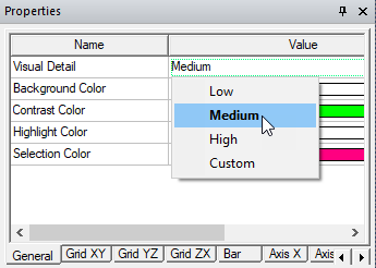 The Visual Detail menu has four options: Low, Medium (the default), High, and Custom. If you select any Visual Detail, the 3D plot is rendered according to the selected Visual Detail level and the properties reflect the values chosen for the selected visual detail level. From this predefined visual detail level, if you modify any properties, Visual Detail is automatically set to Custom (or to another predefined visual detail level if the edits happen to match the settings for that level).