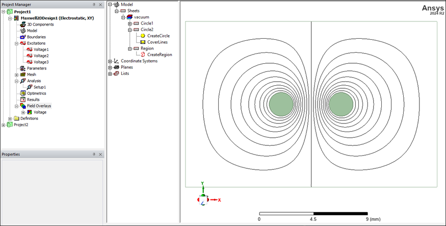 A contour plot of electric potential generated by the electrostatic field simulator is shown below: