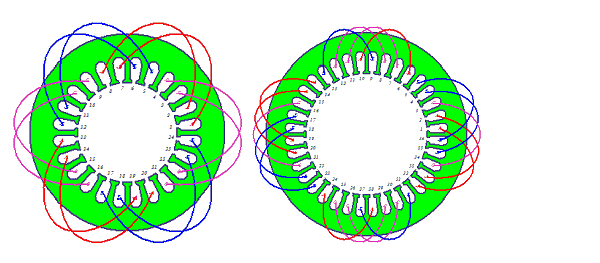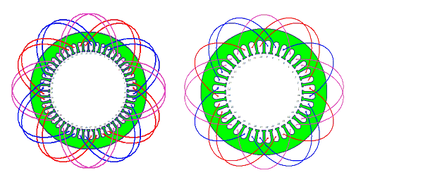 An example of three-phase, four-pole, 24-slot single-layer half-coiled lap-type winding is shown in the figure on the left, and an example of three-phase, eight-pole, 36-slot single-layer half-coiled crossed lap-type windings is shown in the following figure on the right.