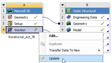 - The Workbench Mechanical system solves and sends stress/strain data (plus displacement data) to Maxwell, which will be used in the Maxwell solution for the next iteration.