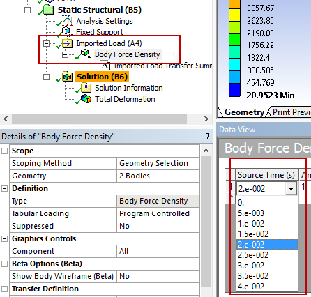 In Workbench Mechanical, select the desired source time point you want to use for the force density calculations.