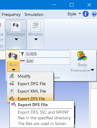 The Ansys Motion subsystem file (.dfsub file) and the Maxwell project generated by Motion (.aedt file) must be in the same folder. - Export a DFS file for use on Linux: from the Motion Home tab, select Simulation > Run > Export DFS file. It should be exported to the same folder as the Motion and Maxwell files.