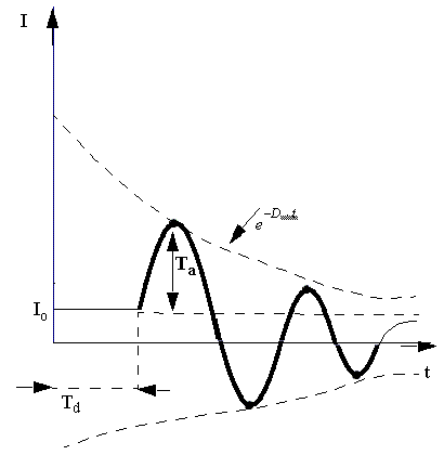 This is an independent current source with an exponentially damped sinusoidal waveform of the current as a function of time. The arrow symbol shows the direction of the positive current flow through the current source.