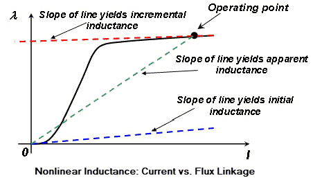 For linear materials, all three inductance values are equal. For nonlinear materials, the three values are generally different. Except for initial inductance, each value varies with the operating point. Ignoring the "toe" of the curve, the relation Lapp > Linc holds. Energy taken from or supplied to the external circuit, as determined from the terminal voltage and current, will be correct.