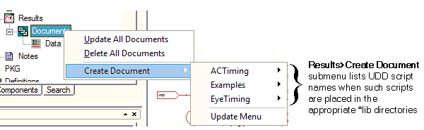 The UDD scripts that are in syslib/UserDefinedDocuments, userlib/UserDefinedDocuments, or Personallib/UserDefinedDocuments become available through the Results > Create Document menu.