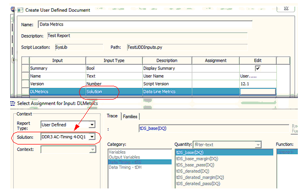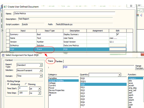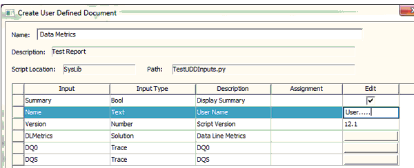 Input Types can be of Boolean, number, text, trace or solution type. The Boolean, number and text type can be given a default value that you can interactively override when the document is created or modified. For example, you can select a trace when you create or modify a UDD document. The trace data is available to the user and can be accessed from the python script.