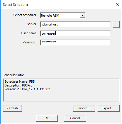Jobs are submitted to the Linux cluster using the user name and password entered in the Select Scheduler window. These settings are persistent; in general, these settings need to be entered only if they change. To ensure security, user passwords are stored in an encrypted format. When a job is submitted from a Windows host using the ansoftrsmservice running on a Linux submission host, the user credentials are sent over the network in an encrypted format.