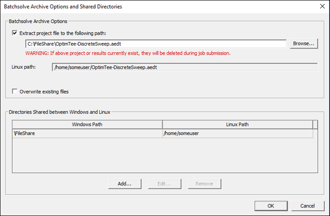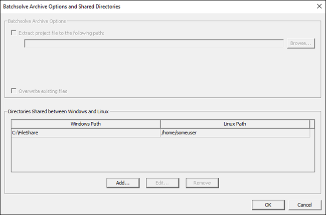 If you specify a project in an archive, the dialog activated by the Options button may be used to specify the Windows pathname of the project to be extracted from the archive. If this is done, the Linux pathname of the target project is determined from the directories shared between Windows and Linux and shown in the upper portion of this dialog.