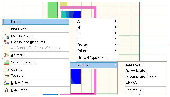 The field overlay plot marker feature enables you to create a marker at selected points in the scalar field overlay plot geometry, and to obtain the field value at that point. The fields Marker submenu enables you to