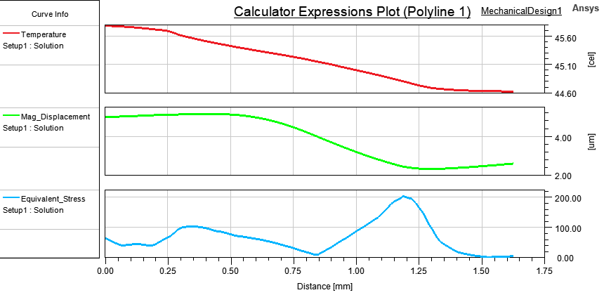 The following example is a stacked rectangular plot of the Temperature, Mag_Displacement, and Equivalent_Stress results along Polyline1 (based on the example model shown in the structural Fields Report topic):