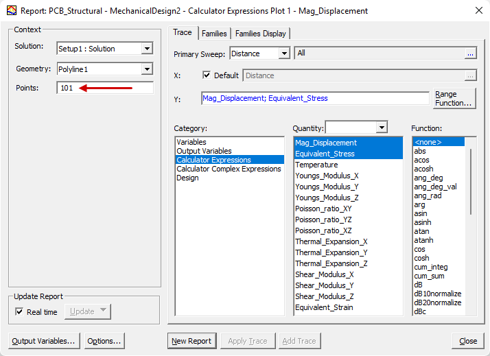 The following report setup example shows the settings to tabulate or plot Mag_Displacement and Equivalent_Stress results along Polyline1: