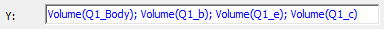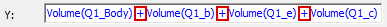 With the Volume of all four parts selected in the Quantity list of the Report dialog box, the semicolons in the Y text box were replaced with plus signs (+):