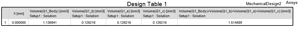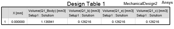 The following example is a data table listing the volume of the four objects comprising transistor Q1. It has been modified to show the volumes in cubic millimeters, and the columns have been reduced from their default widths: