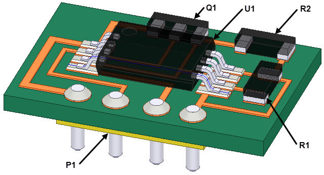 For example, the following image is a sample thermal stress analysis model. It consists of a printed circuit board (PCB), pin header, integrated circuit (IC), transistor, two resistors, and the solder used to connect all of the parts to the PCB traces: