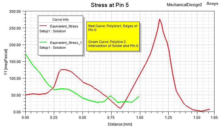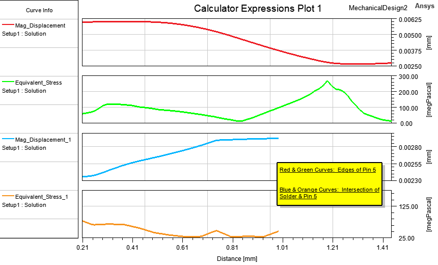 The following image is an example of a four-curve stacked rectangular plot from the same model. The top trace is the Mag_Displacement along Polyline1 (the edges of Pin 5), and the second trace is the Equivalent_Stress along the same polyline. The third trace is the Mag_Displacement along Polyline2 (the intersection of the solder and Pin 5), and the bottom trace is the Equivalent_Stress along the same polyline. For all traces, the X axis is the distance along the polylines: