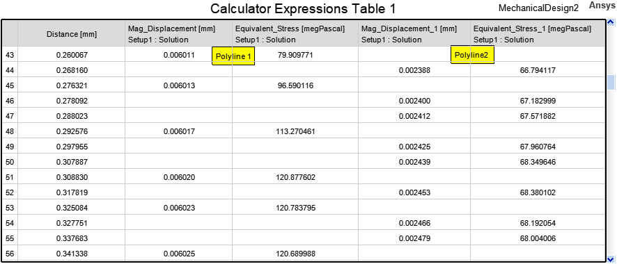 The example that follows lists the Equivalent_Stress and Mag_Displacement results versus the distance along Polyline1 and Polyline2 of the same example model. The results are staggered between columns two and three (Polyline1) and four and five (Polyline2) because the Distance calculation points differ between the two lines: