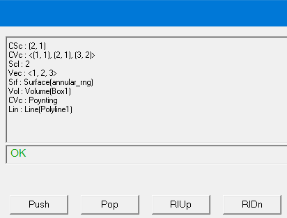| List | These indicators may exist alone, representing geometric data only, or in combination with one of the categories above, indicating a type of data applied to the geometric entity in question. For example, the notation SclSrf identifies a stack entry containing Scalar data on a Surface geometry set. To select only the portion of a given data entry which exists along, on, or within a given geometry quantity, use the Value button in the Output column of the calculator. Other operations (e.g., integration, the Normal button) operate when a data quantity is in the second stack register and a geometric quantity is in the top stack register. Full descriptions of the register requirements for each individual command is available in the online help. |