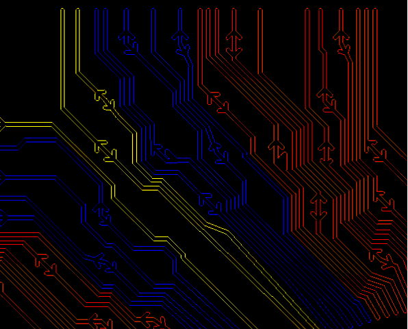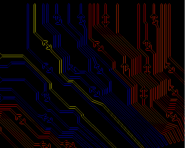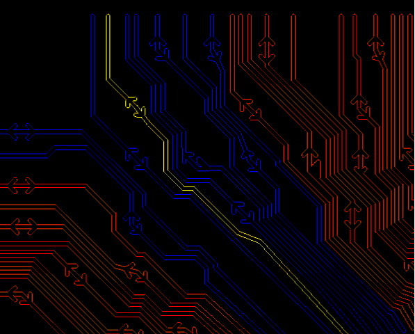 The preferred net grouping size for this partition has now been reached. The net in the middle is also marked valid (yellow) because all of the nets in its neighborhood lie within the active neighborhood. Several nonvalid nets (blue) surround the group of valid nets to model their environment. These nonvalid nets appear later as valid nets within a different partition.