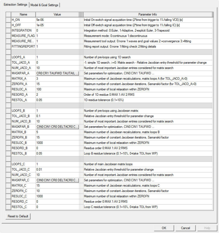 Before preprocessing and interpolation of the on/off switch wave forms, a series of simulated data points must be stored temporarily. These parameters set the acquisition time for the data points. This time interval setting limits the amount of acquired data and must fit to the longest possible time constants at the on/off switch together with a remaining time buffer to allow the Jacobean entry calculation which sweeps every parameter in a wide range. The sensitivity analysis for the 1D search in loop A varies actual parameters from p-25% ... p+50% and the Jacobean-based method does a parameter variation in the range p-10% ... p+10%. This is repeated several times to calculate either the actual best fitting single parameter or a parameter to goal sensitivity coefficient. Thus, the transient wave form duration will vary in a wide range. H_ON and H_OFF are the initial settings for the On-switch and OFF-switch signal acquisition times. The actual Hon and Hoff values change during the characterization. Hon and Hoff derive from the measured switching times and length of the reverse recovery. 5x…10x of the On-switch/reverse recovery time should be a good value. For SiC devices the values should be much smaller than for Si devices. If the initial values are not good, the extraction process will not determine the sensitivity of parameter changes to the output signal and the extraction will not start to converge. You can observe the convergence of the extraction on the Fitting info page and adjust the initial values for H_ON and H_OFF if necessary. |