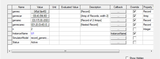 A component properties dialog box may include array or record properties, generically called composite properties, for parameters, quantities, or signals.