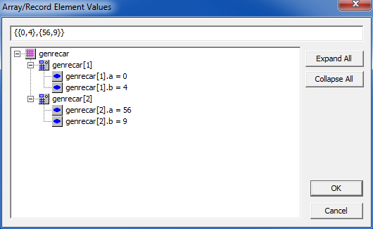 The edit field at the top shows the current composite value, represented as a comma-separated set of numbers, variables, functions, or expressions enclosed in curly braces. Nested arrays or records (an array of records where the record has an array and various other values) are also enclosed in curly braces. Such a value could look like {1,3,{{22,55},44},7e12}. Modify the current value in the edit field to set the array or record value. The updated values will be shown in the tree when focus is changed.