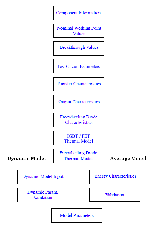 The chart below illustrates the flow of the Device Characterization wizard for the IGBT and Power MOSFET models (Average, Basic Dynamic, and Advanced Dynamic). The topic named in each box is linked to detailed information for the corresponding wizard dialog box.