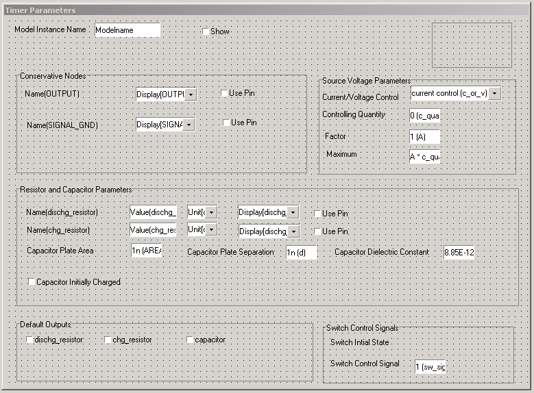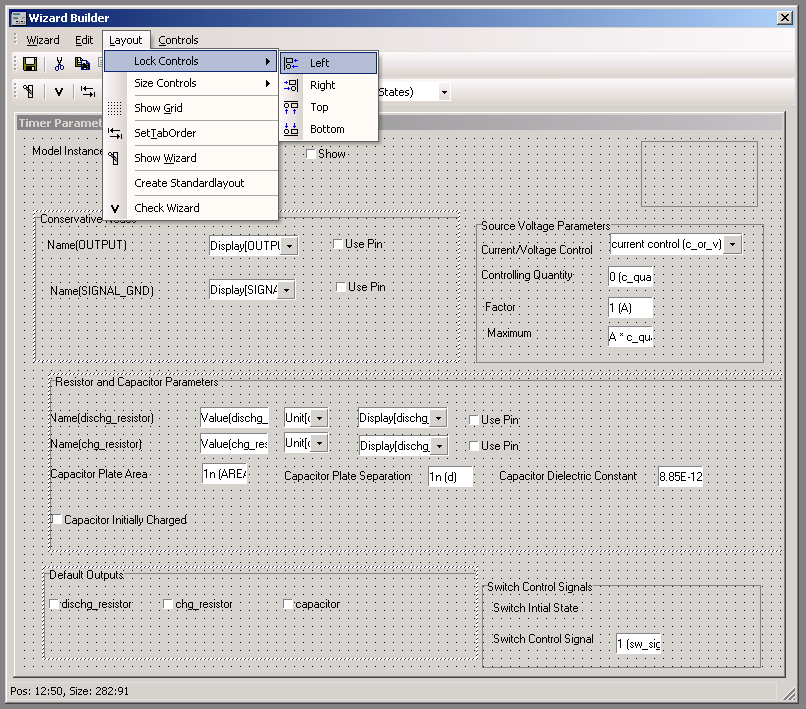 The first illustration in the following example shows the groups Resistor and Capacitor Parameters and Default Outputs selected to be aligned with the left edge of the group Conservative Nodes. The Left lock control is selected from the lock control menu to perform the alignment.