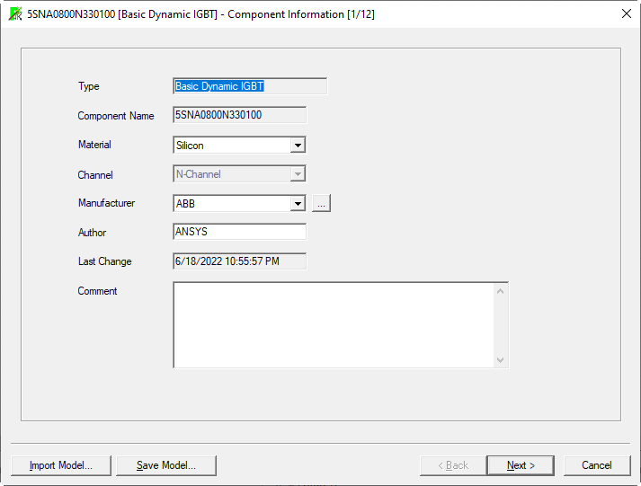 The selection of the material is used to account for major behavioral differences between devices made from different materials. Currently Si and SiC for wide bandgap devices are supported. The compensation for the different values Vgap is done internally through appropriate adjustments of the correction coefficients.