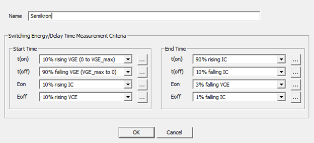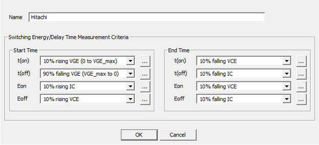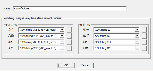 The on-switching energy loss, Eon, is measured as starting at 10% after zero-crossing of rising VGE and stopping at 10 to 20 microseconds beyond this point. The off-switching energy loss, Eoff, is defined as starting at 90% of falling VGE and stopping at stopping at 10 to 20 microseconds beyond this point. Due to limitations of the device characterization tool, the following settings provide an approximation of these energy parameters: Ansys suggests the following on-switch energy settings: