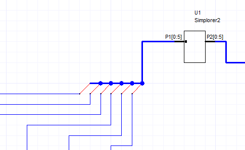 Select Draw > Bus Entryto add visual representations of connections from a bus to an individual net or a sub-bus. On a schematic, a bus may be shown with individual nets (wire) or with wires where the bus width is greater than 1 (drawn with a thick blue line). The Bus Entry object provides a mechanism for visually representing individual wires connected to a bus consisting of multiple nets as shown in the following example. In this example, the P1[0:5] bus is visually “connected” to individual wires via the bus entry objects (the diagonal red lines).